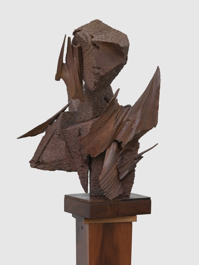 Wim Botha (geb. 1974 in Pretoria/ SA; lebt und arbeitet in Kapstadt) ist seit seiner Präsentation auf der Venedig Biennale (20213) weitreichend bekannt für seine Bücherbüsten. In Berlin zeigt der Künstler auch Büsten in Bronze mit warmer brauner Patina sowie skulpturale Arbeiten gedrechselt aus Walnussholz. Ihre erodierte Form scheint auf ihre Gestaltwerdung jenseits der linearen Zeit anzuspielen. Tatsächlich handelt es sich nicht etwa um Individualporträts als vielmehr um Silhouetten, die beim Umschreiten derselben einen dynamischen Gestaltwechsel vollziehen.