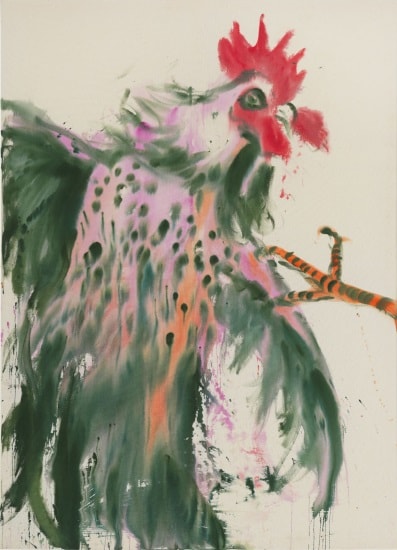 In den letzten drei Jahren hat Dúbravský, der jetzt in der Slowakei auf dem Land lebt und arbeitet, sich von seiner dörflichen Umgebung inspirieren lassen. Sein besonderes Augenmerk gilt dabei seinem eigenen blühenden Garten in Rastislavice. Das kleine Stück Land, das er bestellt – Obst und Gemüse, Pflanzen- und Tierwelt dokumentiert er umfassend auf Instagram, wo sich die Aufnahmen mit aufreizenden Selfies mischen – erscheint hier als Metapher für eine umfassendere Ideenwelt. Der Künstler, der sein Zuhause zur Zeit mit mehreren Hähnen und Hennen teilt, beobachtet ihr Verhalten und ihre Interaktionen. BIRDS AND WIND besteht aus einer Reihe großformatiger Gemälde und Porträts rund um das Thema des Hahnenkampfes, das zu einer komplexen Auseinandersetzung mit dem männlichen Selbstgefühl anregt. Dúbravský studiert die Anatomie und Aktivitäten des Gockels – eines historischen Symbols für Zeugungskraft und Stärke – und setzt seine vorprogrammierten tierischen Instinkte in konzeptuelle Beziehung zum männlichen Ego und zu testosterongetriebenen und oft zerstörerischen Demonstrationen von Potenz und politischer Macht.