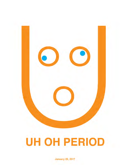 UH OH PERIOD (January 20, 2017) ist ein orangefarbenes und blaues Portrait, das sich aus dem Klang beim Aussprechen der Buchstaben U und O sowie aus zwei Satzzeichen ( periods ) ergibt. Verkörpert die Figur mit ihrem U(h)-O(h)-Gesichtszügen einen kopflosen Trump mit angriffslustigem Blick? Führt uns das in eine Zukunft unter Trump? Beschreiben uns die Satzzeichen ( periods ) als Gefangene einer verrückten Vision in Trumps Kopf? Oder kennzeichnen sie “das Ende”, wie es ein Satzzeichen ( period ) tut, oder eine nicht enden wollende Epoche der Uh und Ohs?