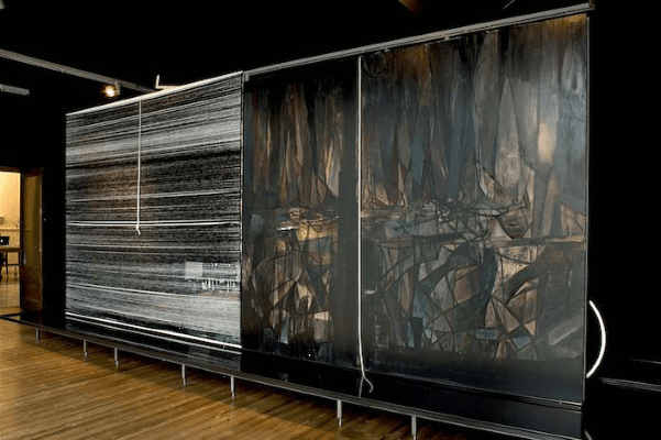 Bildunterschrift: Rosemarie Trockel / Thea Djordjadze A Ship So Big, A Bridge Cringes, 2007 Wool on canvas, oil on canvas, screenprint on Alu-Dibond, steel, aluminium, perspex, foil, water 305 x 691 x 121 cm 120 x 272 x 47 5/8 inches © Thea Djordjadze & Rosemarie Trockel / VG Bild-Kunst, Bonn 2017 Courtesy Sprüth Magers
