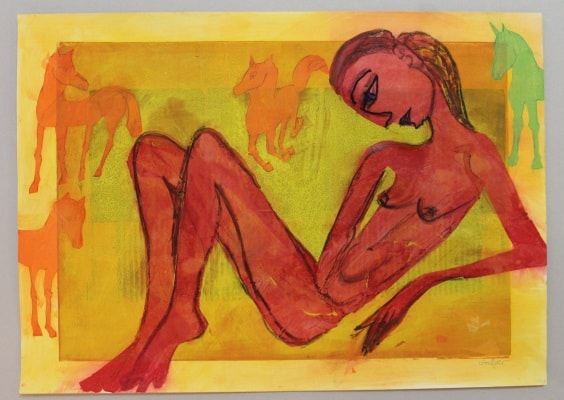 Bildunterschrift: Margit Grüger, Frau mit Pferden, Gouache mir Collage auf Papier