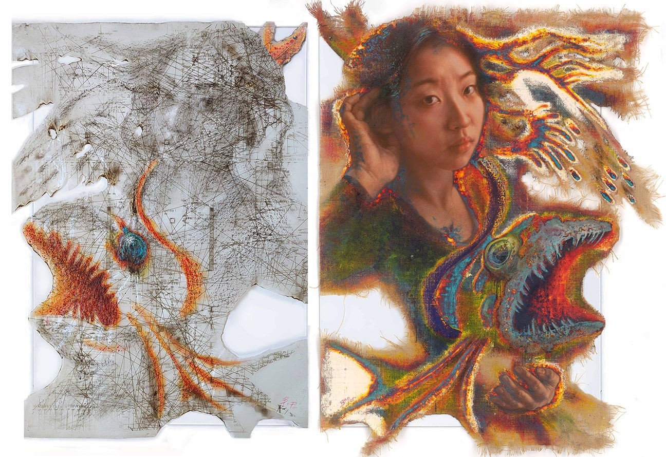 Bildunterschrift Titelbild: Boriana Pertchinska, Beasts V, 2023, Left part: pigments, acrylic, chalk base on jute / Right part: pigments, acrylic, charcoal, fire on paper, diptych 130 x 170cm, ©B.Pertchinska