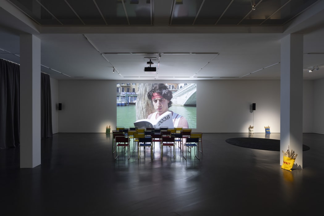 Christopher Roths Präsentation findet anlässlich seiner neuen Filmtrilogie statt, die sich mit der Geschichte geografischer und philosophischer Grenzgebiete, Familie und Freundschaft sowie mit der Zukunft befasst. Die Präsentation, die mit Skulpturen überdimensionaler Pommestüten und einer bunt kolorierten Ausgabe englischer PEL-Stühle (neu gestaltet von Jasper Morrison für TYP) als provisorisches Kino in Erscheinung tritt, thematisiert Europa als ein sich ständig bewegendes Ziel. Tagsüber wird im Rahmen der Eröffnung in der Galerie eine Lesung von Lukas Kubina aus seinem neuen Roman Boludo stattfinden, gefolgt von einem Konzert von Macedoniasintetica (Carlo Camerin, Mattia Rigon, Simone Carraro) und einem Screening von Metagoon 24h mit Matteo Stocco und Matteo Primiterra.