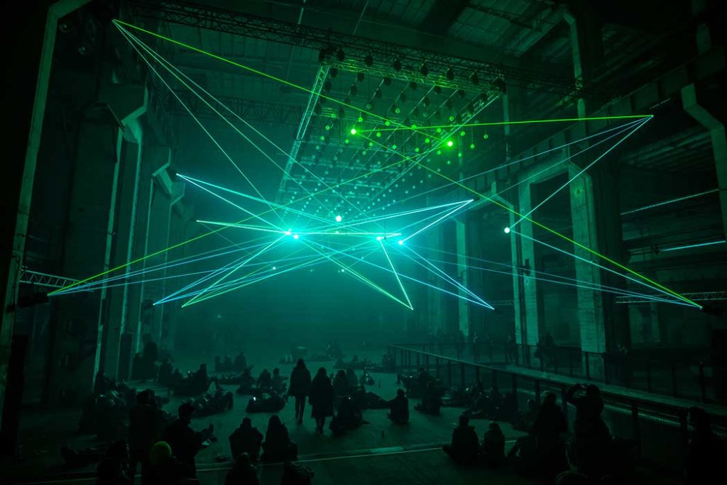 In der Kollaboration von Lichtkünstler Christopher Bauder und Musiker und Komponist Robert Henke bewegen sich 175 Kugeln, von farbintensiven Lasern angestrahlt, in synchroner Choreographie zu einer mehrkanaligen Komposition. So entsteht eine visuell beeindruckende Analogie (30 x 20 x 10 m) zu digitalen Netzwerken mit ihren Knotenpunkten und endlosen Verbindungen.