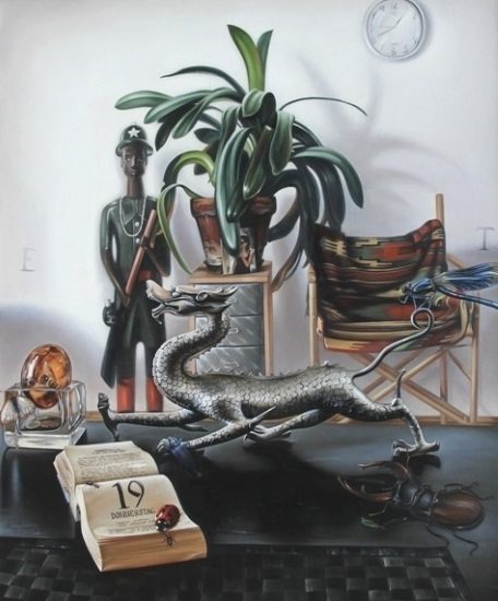 Bildunterschrift: Elena Tarasenko, Interieur mit Drache, 2014, Öl auf Leinwand, signiert, datiert. 120 x 100 cm