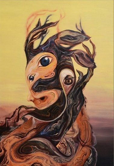 Die Bilder, die die Künstlerin erschafft, konzentrieren sich auf die Ideen, wie das menschliche Dasein mit anderen Erdlingen verbunden war, ist und sein könnte.