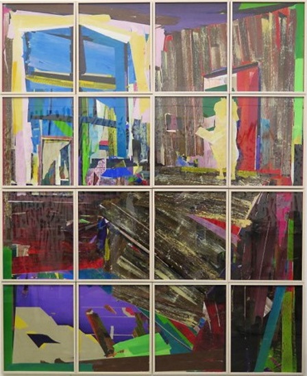 Image caption: Tino Geiss, Vortrag (16 Teile), 2012, 205 x 166 cm, Klebebandcollage