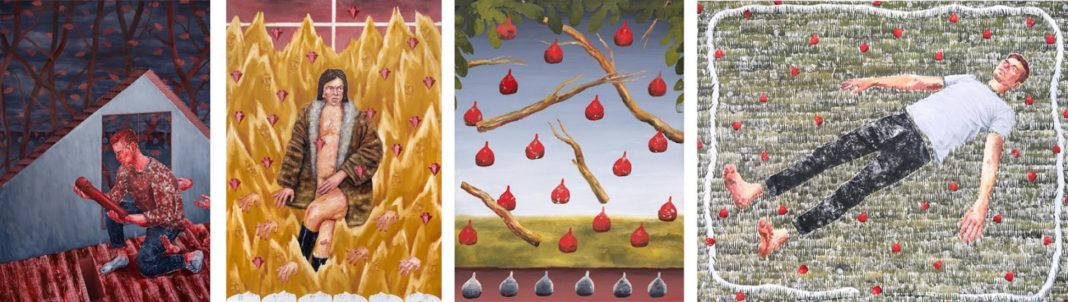 Image captions (f.l.t.r.): Adam Lupton – The Hellish Tattoo of the Heart, 2021, Oil and acrylic on canvas, 140 x 200cm // Shiny Shiny, Shiny Boots of Leather, 2021, 140 x 200 cm, oil on canvas // Landscape with Branches and Figs, 2021, oil on canvas, 60 x 80 cm // Human Entropy, 2021, Oil on canvas, 220 x 180 cm. Images courtesy of the artist