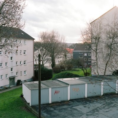Heller’s landscapes are of a radical banality. They are the world of Wuppertal suburbia; suburban streets devoid of “charm”, or “atmosphere”. They are motifs containing a perfect casualness, nowhere a point made. A void fills the image, apartment buildings from the fifties and sixties, when housing blocks were granted saddleback roofs still, gray architecture. In the background we see a gas station, an industrial yard, garages. Everything in pale winter colors: nondescript white, brown, black, a faded pink.