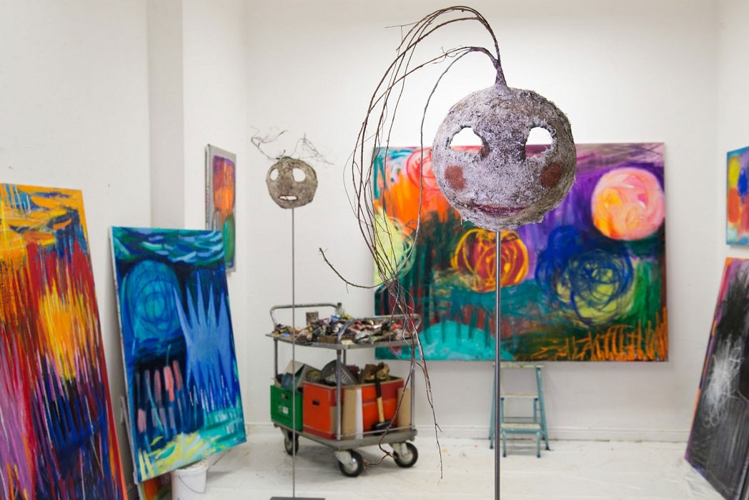 In this present age, in which nature has become a plantation that can be formalized and scaled, and the plant world has been pushed to the margins of our perception as an insignificant splash of colour, Steinert brings nature forcefully back into focus. With carefree and playful curiosity, she explores in her vibrant paintings the energy fields, emotional landscapes and nuances that surround us all. Her powerfully vivid motifs tell of anger and rebelliousness, playfulness and urgency, humour, darkness, dreams and nightmares. The physically gestural squiggles and strokes in her paintings, like her masks, are reminiscent of fine antennas – highly sensitively aligned, they receive and transmit simultaneously and connect us and everything with each other.