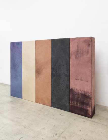 Image Caption: Anneliese Schrenk_Korper_5 piece s_2015_reworked leather on wood construction_182x56x28cm each_Courtesy of Circle Culture Gallery