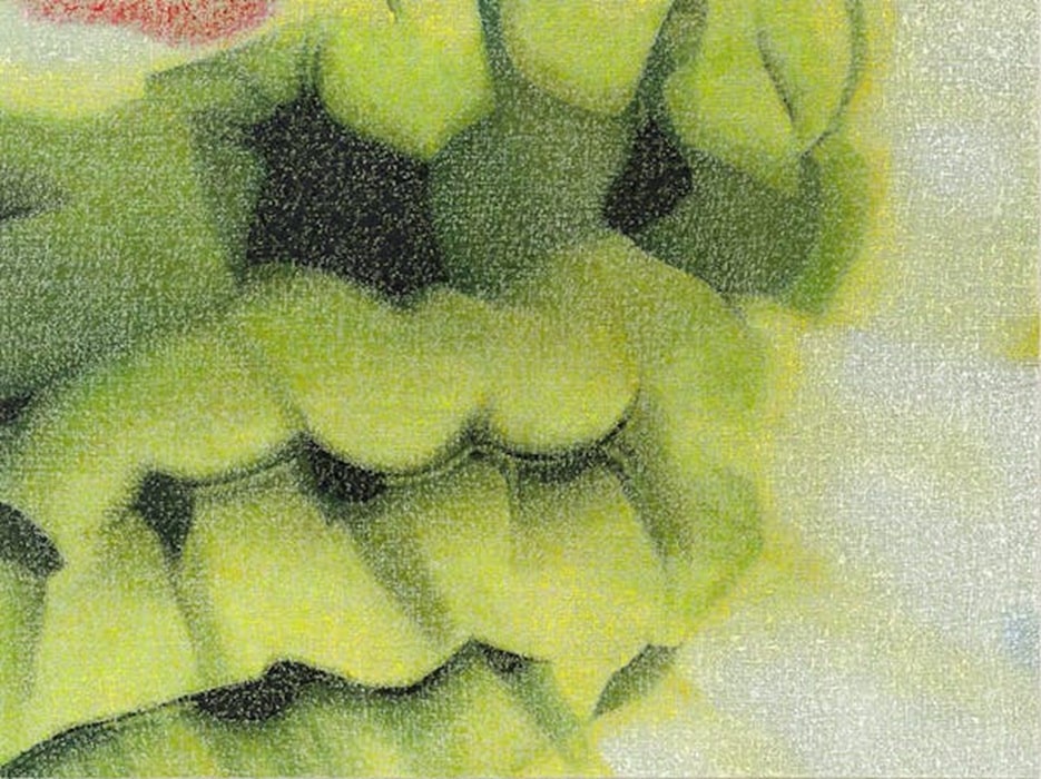 Her works are characterized by a specific grid-like structure that is made of colour pigment applied onto the medium surface. Oil paint is attached with spatula onto coarse burlap creating varying degrees of flatness, opacity and an interplay of depth and volume. The resulting pixel-like structure alternates between abstract shapes and blurred or distorted human forms.