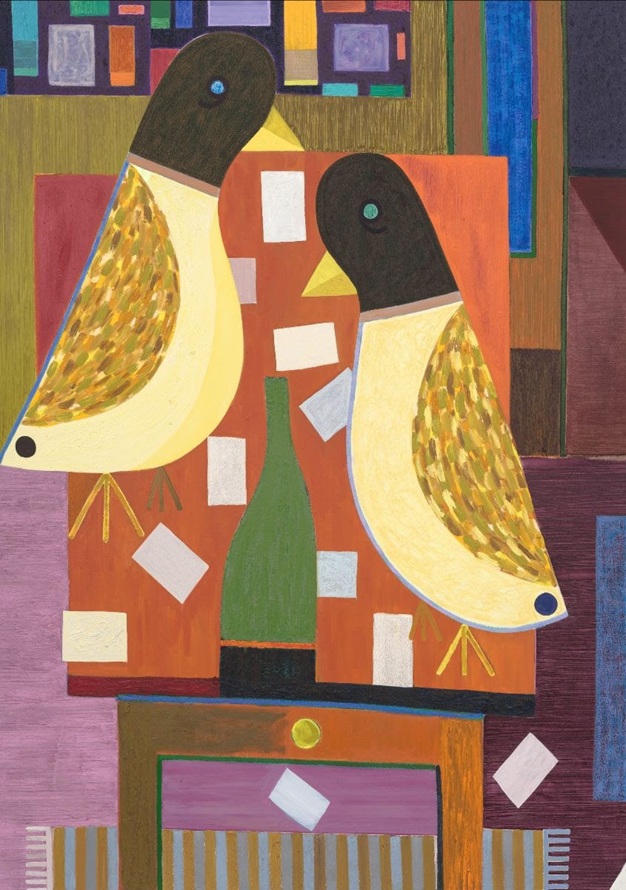 With The Card Players, Austin Eddy again refers to Paul Cézanne, who painted a series of five pictures with card players in the 1890s. Versions three to five are now regarded as pioneers of Cubism. Instead of people, Austin Eddy has two birds sitting on a table full of cards. Birds, like humans, have spread and populated the earth with thousands of species. Birds in Austin Eddy’s work often represent people close to him. And the card game becomes a metaphor for life: A common game that suddenly turns into something serious.