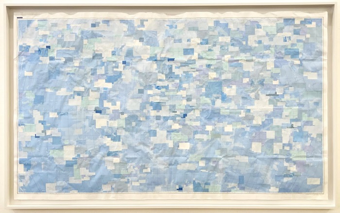 Wasserfarben (Watercolors), 2024, world map, various papers, glue | 114 x 188 cm | 45 x 74 in | 3.7 x 6.2 ft