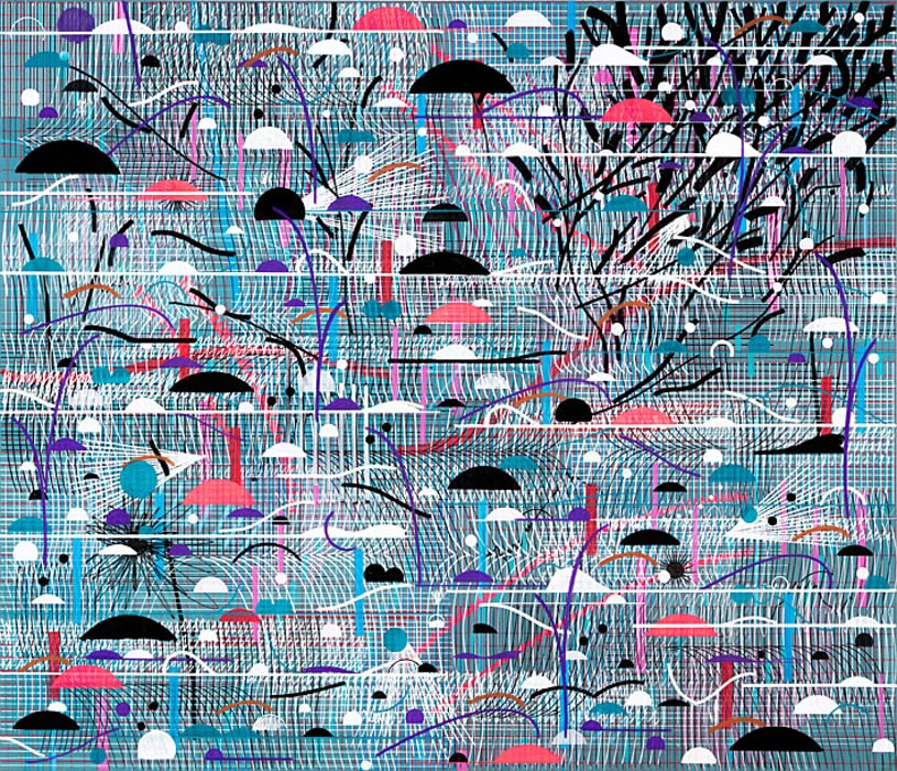 DAG’s paintings consist of structures, shapes and patterns from the everyday world as well as layered media elements. They are created by working directly on the canvas, reworking image zones and adapting compositions. DAG combines colour and structure on the canvas. The geometric forms and constructions that characterised his earlier works are less dominant in the new paintings, giving way to open areas and graphic elements. Several pictorial layers overlap and create a non-illusionistic, abstract spatiality. The structures and forms are in a process of creation and change. According to Bernhard Waldenfels, there is a marked point in the visible that emphasises its visibility.
