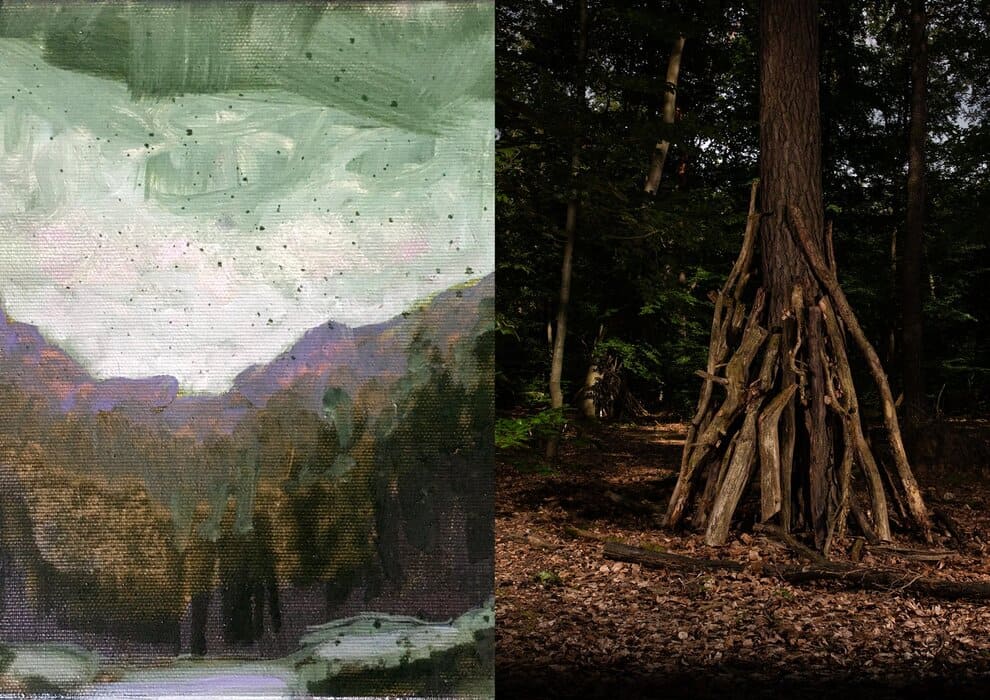 Bildunterschrift Titel: links: ©Oliver Gröne, Berglandschaft, 2024, oil on canvas, 24 x 30 cm (Detail), rechts: ©Wolfgang Siesing, Wald II, 2024, photo print 24 x 30 cm (Detail)