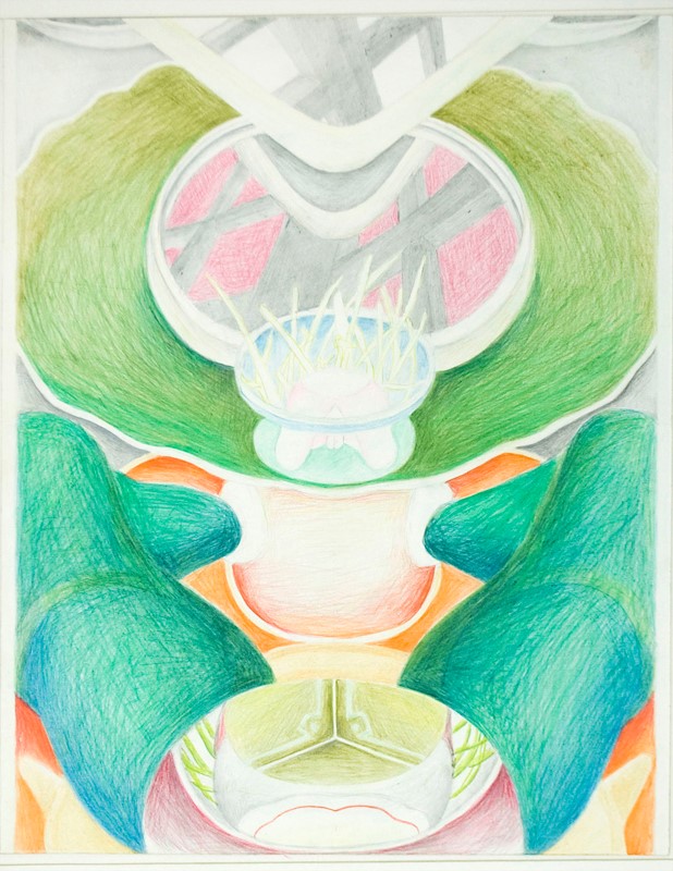 One drawing in the set stands out as it consists only of lines or contours, the outlined areas blank. The lines are the outline of a hand drawing an oval. It is a drawing representing the act of drawing. The shape drawn by the hand, a shape with round corners, appears in another drawing as fragment of a hand mirror, a leitmotif in many of the drawings. In this mirror image, Anna Oppermann presents us a world that we are only shown in single snippets – a world on which her own gaze is mediated by the mirror. The artist enters a closed-off domestic world that she seems to break free from via the drawing. The view at the outside world appears as image framed by the mirror. This kind of perception introduces varying perspectives as composition principles of these drawings. The viewer has a bird-eye perspective on the drawing, which directs the gaze from the worm‘s-eye view to the sky outside. Top views and low-angle views interlace, creating spatial constructions in which the constant shifts in perspective guide and seduce the eye of the observer into various positions. The reflected image is reflected once again by yet another mirror. Any hint at an outside world, e.g. a bit of sky, is merely a reflection. Perceived as so many refractions, Anna Oppermann‘s world is composed of the fragments supplied by this “hall of mirrors”. Reflections of reality become image details. Internal motifs, framed as if by accident and furnished with a domestic iconography of potted plants, chives, kitchen-table still lives, become image-worthy, representing an interior both kaleidoscopic and claustrophile. In the second half of the 1960s, when these drawings were made, Anna Oppermann seems to have opted for a life being an artist in and looking out of a peep box.