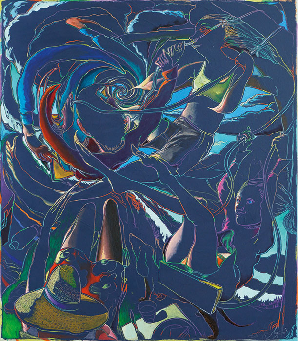 As far as the formal construction of the new pictures is concerned, they fascinate with their extreme dynamics as well as with their complicated and irritating perspectives. Thus the effect of the pictures is dramatically increased. Everything is in motion, turbulences dominate the compositions. Everything is exposed to centrifugal forces. People, objects, natural things – everything is shaken and deformed as if by powerful gravity, and disappears as if in the eye of a hurricane.