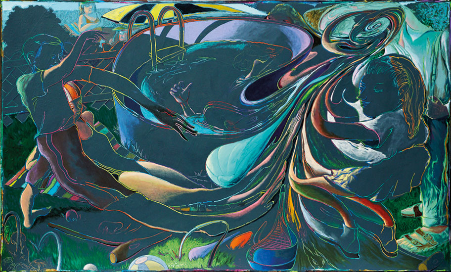 Spaghettisierung am Pool, 150 x 250 cm, Acryl auf Nessel, 2018