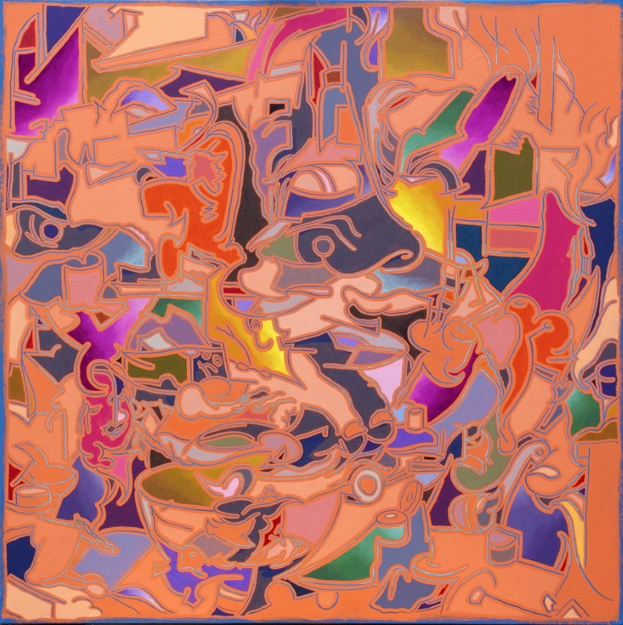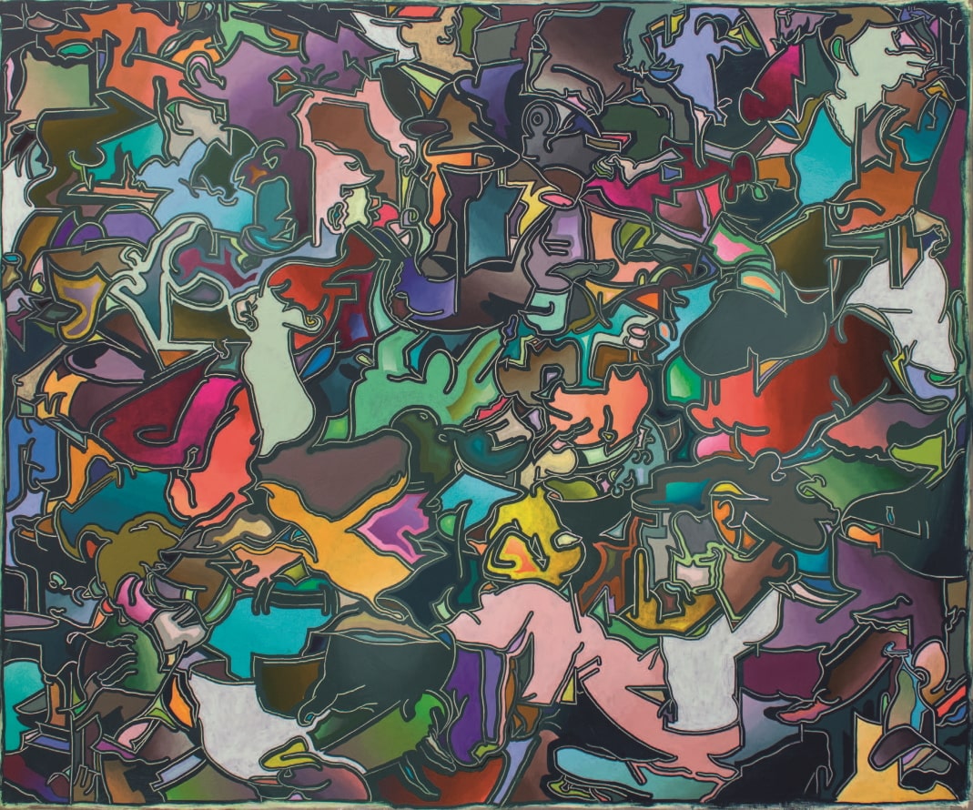 The fantastic, the absurd and the monstrous, deformations, metamorphoses and transformations as well as references to tragedy and comedy as well as to art and literature play a primary role in Bojak’s art. In the most recent work phase, “New Order”, begun in 2020, another characteristic of Arno Bojak’s art comes to the fore – camouflage. The figurative, representational and descriptive elements of his earlier work phases are not completely abandoned in the new series of works, but they are strongly enigmatic or seem to be hidden unavailable under surfaces or structures. Arno Bojak condenses the meaningful representational narrative structure of his pictorial motifs in such a way that it approaches an abstract surface. What remains are camouflage-like hidden associations of the representational. “The colour has withdrawn from the objects. It no longer wants to describe, rather it condenses into surfaces and leads a life of its own,” says the artist himself.