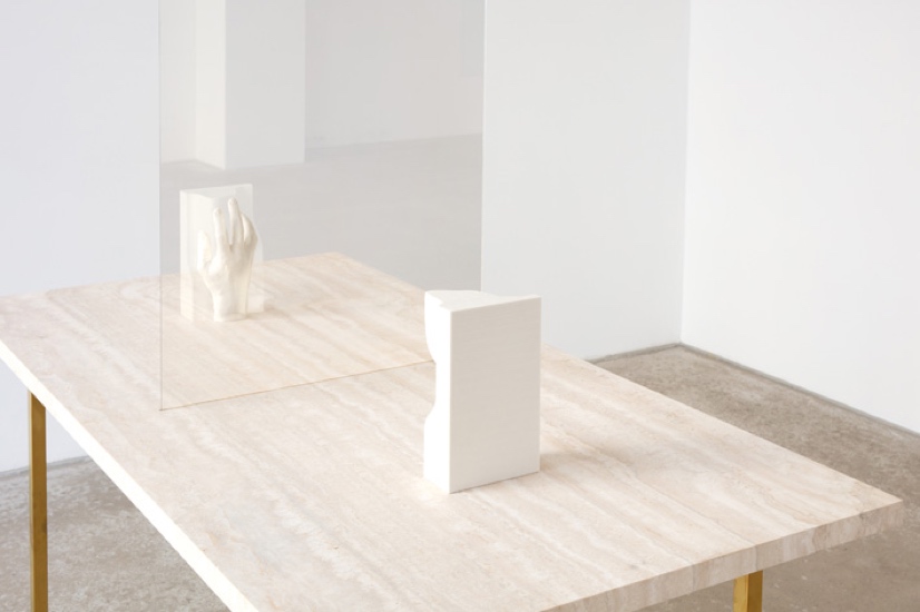 Aron Mehzion brings to mind Duchamp’s practice in his piece „Corrélation non-local“, the mold of a left hand opposite the cast of a right hand, both objects being simultaneously separated and connected by a semitransparent mirror. Looking into and through the mirror it becomes apparent, that the cast and mold fit together perfectly. One mirror image overlaps with the other, the moment of touch between hand and plaster is manifested there. The transparent mirror shows the impossible touching of two objects, each of them can only exist as a direct result of this contact.