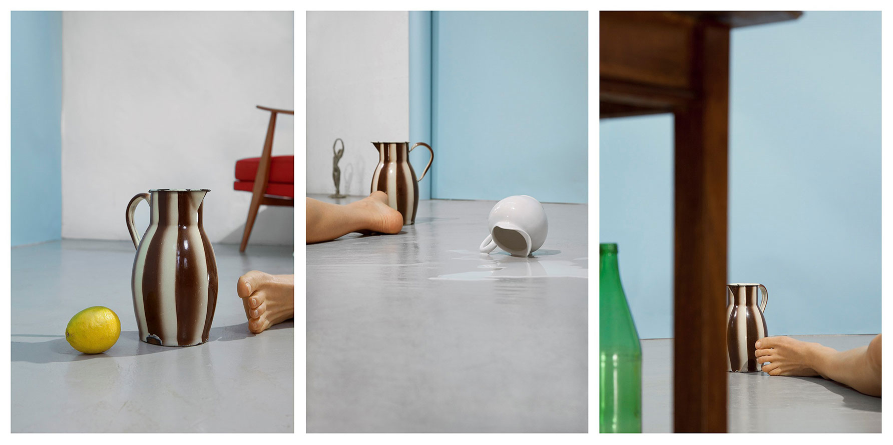 The scene described could pass as a classic still life if it were not the subject of a triptych whose three images all revolve around a specific moment in the scene, featuring it from various angles. Barbara Probst uses a radio-controlled mechanism to create her Exposures, which allows the artist to simultaneously release the camera shutters from a distance. By this means a series of images is generated which breaks up the supposed reality of the moment into several views.
