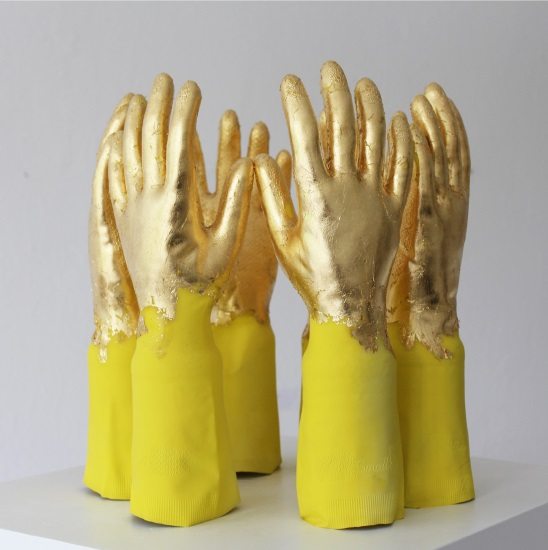Image caption: Beate Rothensee “Der innere Kreis”, Gummihandschuhe, Schlagmetall, ca. 23 x 23 x 8cm