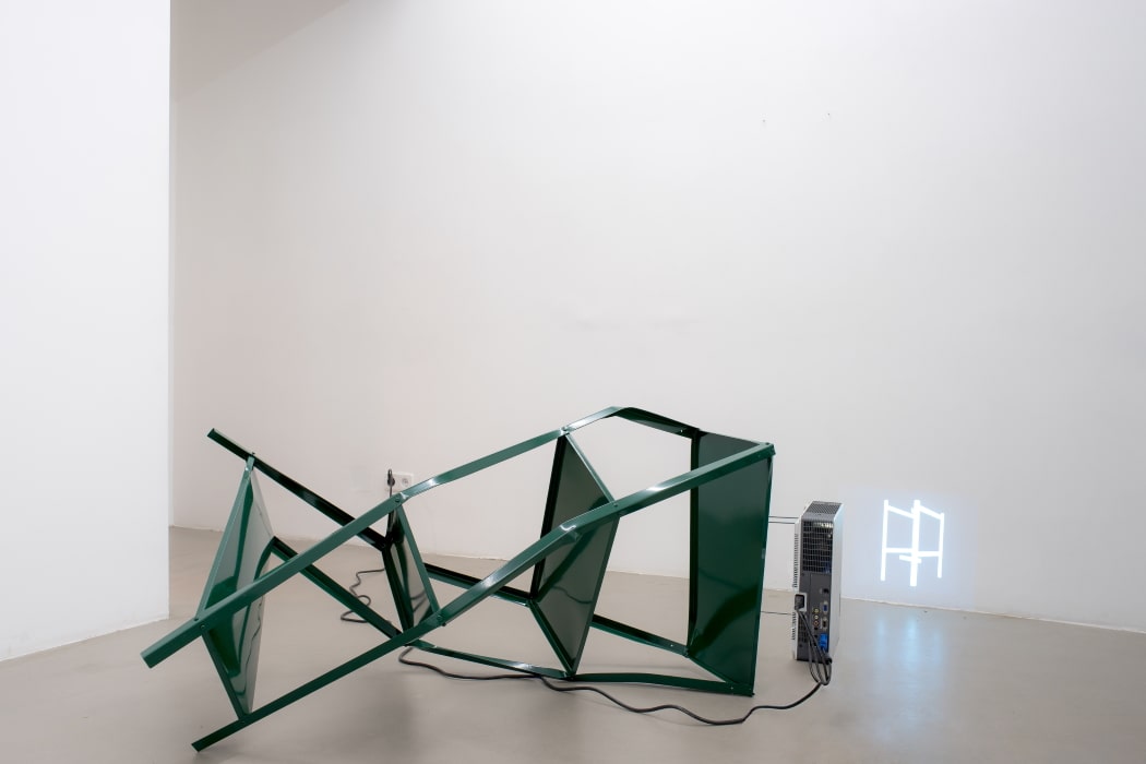 Powder coated metal, video projector, (DVD) player, video: 4min. (color, without sound, loop)