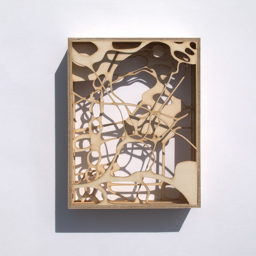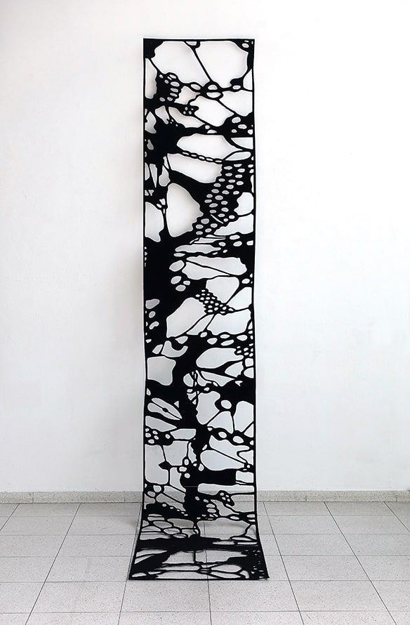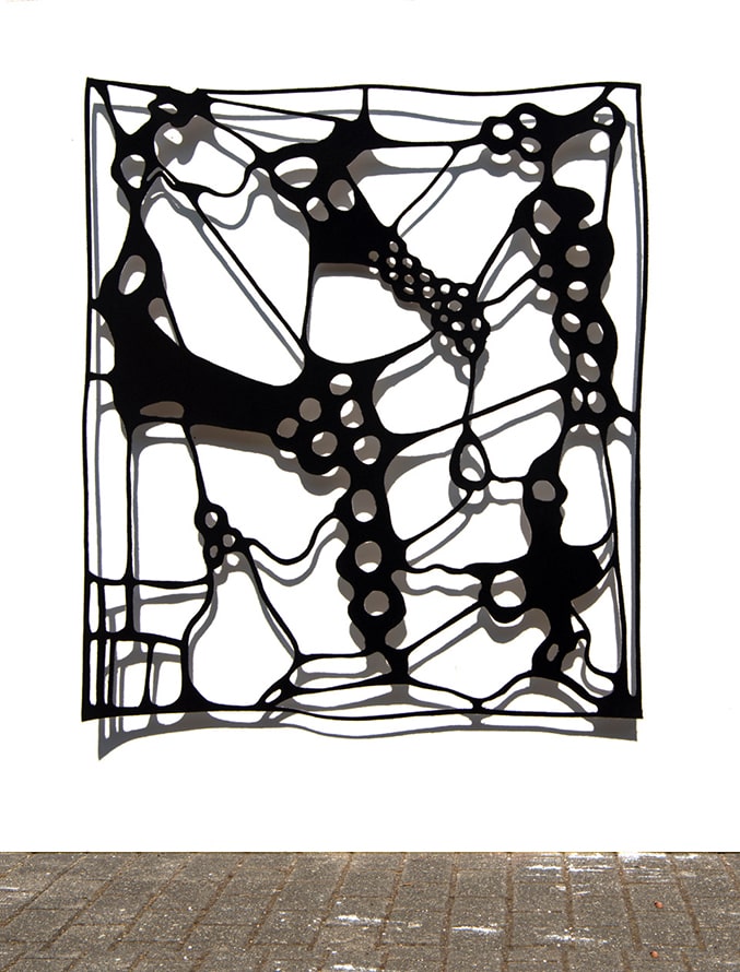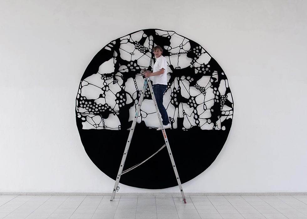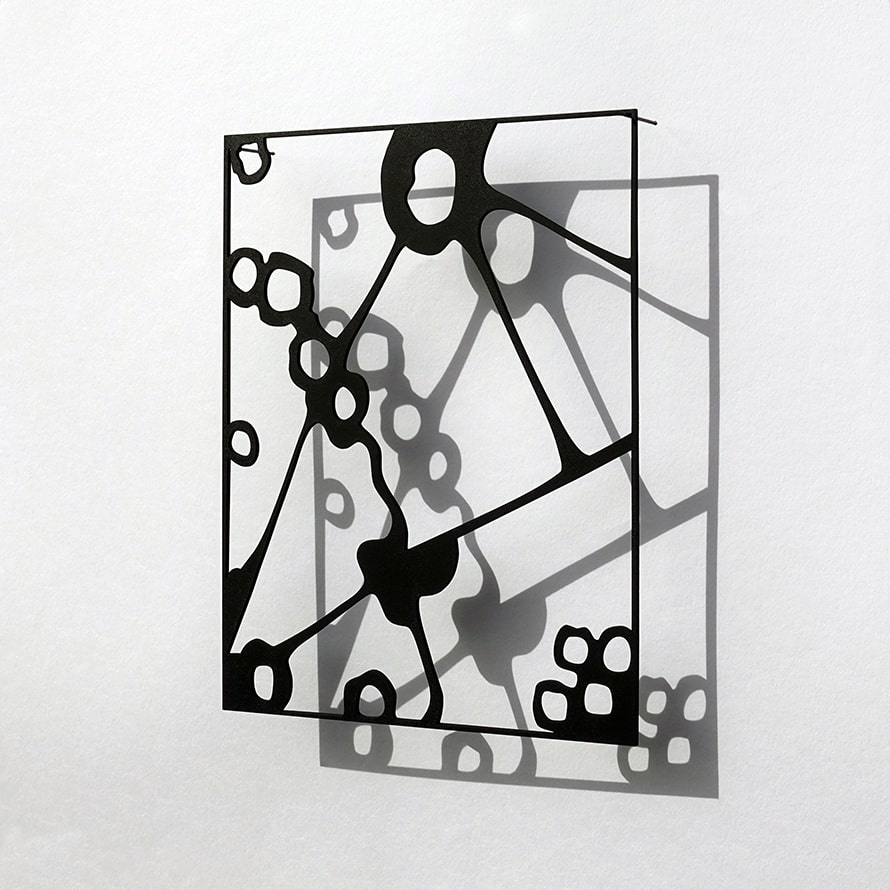 His works from the series “window of the mind”, which he creates in different materials, sometimes felt, sometimes wood or aluminium, are hung at a distance from the presenting wall. The resulting shadows create a three-dimensional effect that initalises a scan of the memory content and can arouse enormous emotions. Korsig’s intense preoccupation with the human brain awakens associations with neuronal networks, cell structures or viral proliferations. It is the play with ambivalent emotions and the irritation of one’s own visual experience that appeals to the artist.