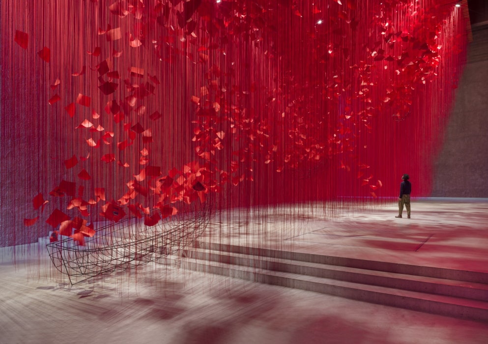 On entering the space, there was immediately a strong sense that this was about something quintessential – all too quintessential, in fact – that concerned all of humanity, without exception. Overhead was a handwoven sky of bright red yarn from which hung 180,000 metal keys from all corners of the Earth, floating like stars of life almost close enough to touch. Beneath them, resting on beams like bodies, were two old wooden boats, which, proclaiming the absence of people, had forever fallen out of time.