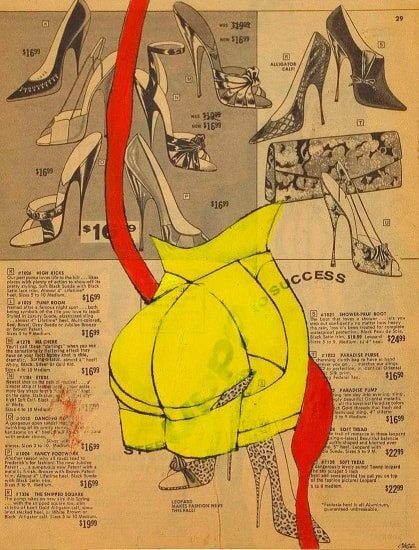 In a series of collages and drawings dating from 1961-63, sensual and mechanical pendulous forms are derived from lingerie catalogues – both as source material and the ground onto which he works. Borrowing shapes from these commercial magazines, the increasingly abstracted designs incorporate underwear bursting at the seams, perilous high heels and isolated sections of an erotically charged female form. These often appear as technical appendages, creating a diagrammatic bionic form. Trailing tentacles and teats resemble limp hosiery or loosely drawn anatomical diagrams, reducing the human body to its constituent parts.