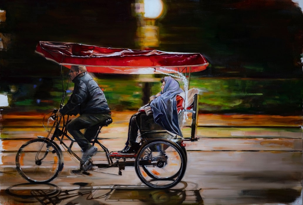 Gordon portrays urban life – his works, created in a realistic manner, are reminiscent of photographic images. He transforms these brief perceptions into poetic, almost magical moments. He conveys joyful emotions, but also fears, in the people depicted. These “painterly” observations develop an extraordinary radiance and condense in their contrasts into sensual units. The paintings raise questions and allow us to pause and immerse ourselves in what we see – in the moment. His painting is always figurative, the brushstrokes impasto and self-confident. Not only the “day paintings”, but also his large-format oil paintings, on which Gordon works for months or even years, emanate a very special atmosphere that is based on the painter’s remarkable powers of observation.