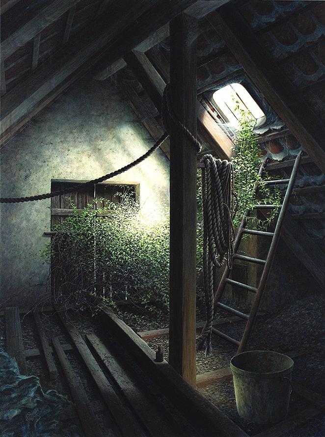 Whether bursting out behind high cloud mountains, plunging a forest clearing into the soft dawn of day, or throwing fields of sunshine through an attic hatch — the light always comes from beyond the pictorial space, becoming invitation, promise, foreshadowing, and mystery.