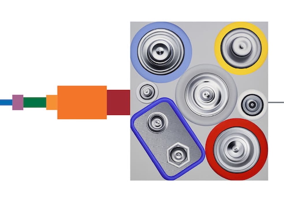 Six new paintings by Silvares are installed across Hip Hop, which runs through their core and resumes a connective horizontal line between them. Four large-scale paintings are hung sequentially; each depicts an abstract landscape comprised of viscous mounds that appear to unfurl slowly, interrupted only by the crisp contour of metallic objects. Metal is a recurring motif that exerts symbolic power; its hard, lustrous, reflective shell evokes the promise of modernity with its scientistic notions of cleanliness and the antiseptic. In Pillars (2025), a finely polished pipe empties a bulge of viscid silver into the painting’s foreground while Mill (2025) exhibits a helical screw blade. Titanium (2025) depicts a clenched tube facing it’s squeezed-out white paint; the silhouette is reminiscent of an hourglass and idiosyncratic for the artist’s seamless brush strokes. Hiperlink(2025) depicts interlocked snap hooks and pays tribute to Leirner’s trademark gesture of tying, clipping, or otherwise attaching products bought at hardware stores into extensive installations. As a can in vivid red is crushed inside a hydraulic press, time appears to stand still in Pole (2025). Suggestive of a crumbling pillar, the work’s vertical composition briefly halts Hip Hop, while tapping into Anthropomorphic’s tall, tranquil dynamic. Executed in oil, Silvares’s 808 (2025), depicts shiny and perfectly round knobs in aluminum grey, embraced by intense shades of red, yellow, and blue that read as another nod to Mondrian. Another reference, indicated by the work’s title, is the iconic drum machine Roland TR-808 Rhythm Composer, a bedrock of early hip hop samples.