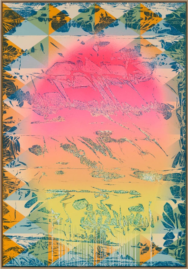 This skinning, peeling idea means the shedding of a given surface with the desire of renewal. But what does the painting want to get rid of? If one looks through the layers of paint at the underlying composition-determining forms, geometric patterns are discernible, which in their prism-like light dark alternation are reminiscent of iridescent spaces in the manner of Op Art. Towards the center of the picture, the logic of constructivism is lost and undergoes a metamorphosis into indefinable forms that evoke associations with the representational, vegetative or animal. The process of the “falling apart” of the forms, which culminates in the middle, is outshone by a luminous colorfulness. It diffuses completely freely and contourlessly from the center of the picture to the edges. The color transition from pink to orange to bright yellow is powdery and light, almost immaterial, and creates an atmospheric mood on the surface of the picture. And as in the coloristic color clouds of Dutch (landscape) painting of the 16th/17th century, a metaphor for the emotional and ethical is transported in the luminous ether of Streuli’s paintings.