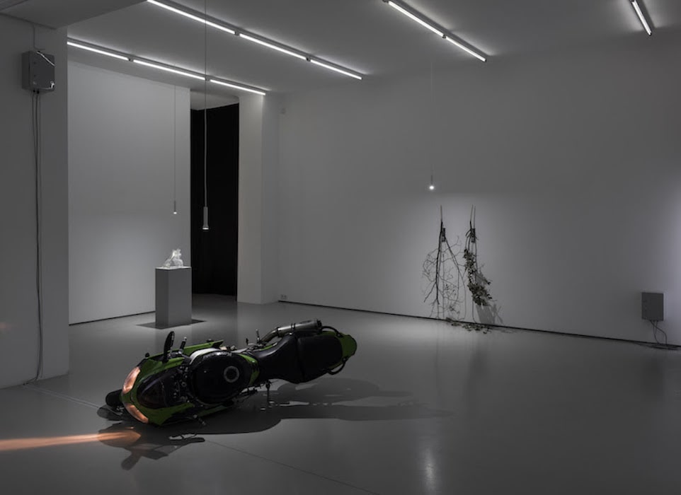 Schmetterling (Kraftrad) (Butterfly (Motorbike)) translates the electrostatic tension of global lightning strikes in real-time: each time lightning hits the earth somewhere in the world, the lights flicker. The absence of subjects in these three works drives the objects’ functionality into the absurd – a dystopian world of things inextricably combined with natural phenomena and natural laws. As a sequence, the three works push through the layers of Earth to the surface and beyond, simultaneously tracing the civilising arc of technical advancement and the estrangement of civilisation and nature.