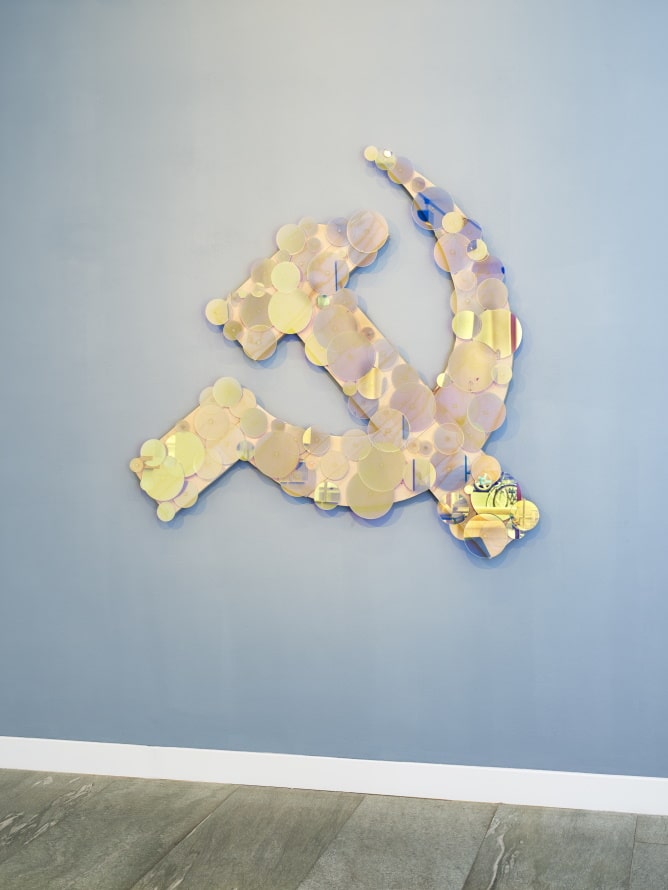 Jens Gussek, Hammer und Sichel, Wall object, dichroic glass on wooden carrier,