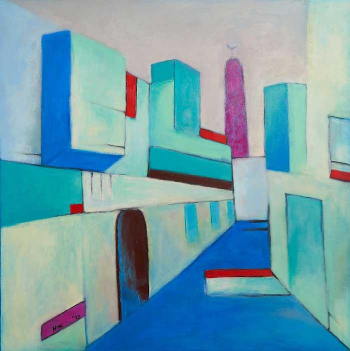 Huda Al Saie, Distant Minaret, 80 x 80 cm, Acrylic on Canvas, Photo: Matt Wardle