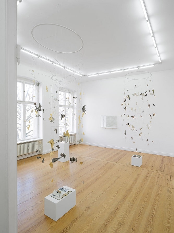 Kurt collected ornithology books, which he read with fascination but also treated destructively: he cut out every illustration that showed a bird. What remained were books with eerie holes and gaps, showing only the negative outlines of the cut-out birds. However, Kurt brought them back into the sky: as mobiles, as cut-out paper birds pinned to the walls that populate his alternative world.