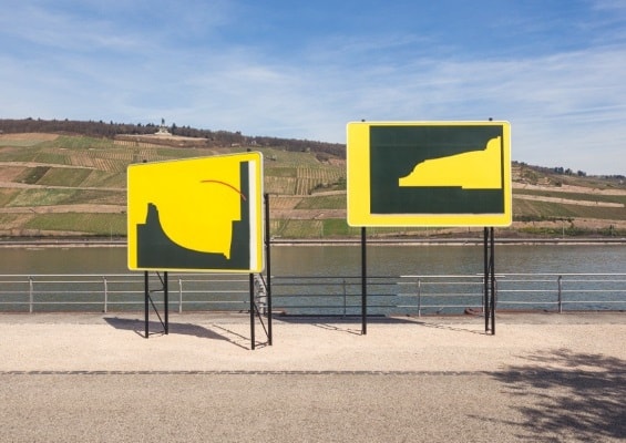 Jay Gard concerns himself with semiotics, architecture and visual perception theories in his works. For the curated outdoor space of Art Rotterdam, in front of the Van Nelle Factory, Gard designed and built an installation of two signposts, wooden replicas of signs for tourists as found in every highway around the world. Gard reduced the images to a two-part geometrical form that is reminiscent of the horizon. The signs became minimal landscapes.