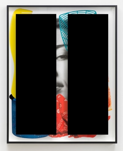 Image caption: Kathryn Andrews, Black Bars: Déjeuner No. 14 (Girl with Bandana, Campfire Mug, Comb, Grapefruit Slice and Fly Swatter), 233,7 x 186,1 x 11,4 cm, aluminium, Plexiglas, ink, paint, unique