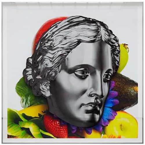Image caption: Kathryn Andrews, Tutti Frutti Ancients and Moderns, 2019, stainless steel, aluminum, glass, ink, paper and paint, 112 x 112 x 5 cm