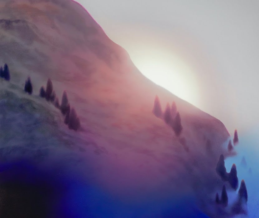 In Lena Keller’s landscape paintings, a melancholic mood drifts across the canvas like a gentle breeze, almost lovingly wiping away any brush marks that might suggest a personal touch. Keller utilizes computer-manipulated digital images as templates and virtual filters to exaggerate colors, contrast lights, smooth and flatten details. This is a reference to the tools everyone carries in their pockets, on Instagram, or in image editing apps. Now digitally produced by humans, landscapes have become a contemporary expression of mood rather than a representation of nature. On the canvas, Lena Keller translates the image templates into paintings. Some parts remain realistic, while others dissolve into blurriness. The same applies to the contours. Some remain sharp, while others burst like flames into adjacent areas of color. This also creates emotional uncertainties: Are we looking at pristine nature here? Or is it under attack? Are the trees diseased? Is humanity’s poor treatment of the environment evident here? The negation of the individual hand movement, the artist’s trace-free painting, provides the spectator with a direct view of the landscape. And still, there is a certain distance. In classical landscape paintings, especially in the Romantic period, the distant horizon over a sea or mountain landscape dissolved into a blur. This blurry part challenged the viewer’s analytical mind. The distant horizon eluded them, suggesting the existence of nature beyond their grasp. It was precisely this place that fantasy and longing could occupy, much more intensely than in a view of an idyllic backyard or a well-kept garden.