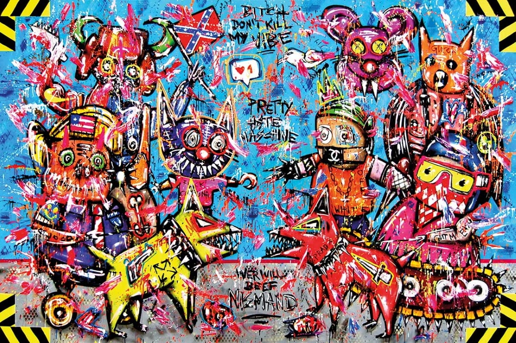 In his works, the artist wages a battle between rules and anarchy, between harmony and destruction. His pictorial agenda of a societal sweeping contains reminiscences of Grosz and Dix, his direct-naïve style catapults Basquiat‘s expression into the here and now. His pictorial composition deconstructs Bacon and Velasquez beyond recognition. Thus, he combines the grime of today‘s street with the heroes and conceptual theories of established painting, playfully breaking traditional genre boundaries. Jung is a total realist who has made everyday madness his subject and depicts it in a very unique sarcastic and ironic way. For him, art is the gigantic funnel of an oversized meat grinder that sucks up all his daily observations, mashes them up, and spits out something that brings the multi-layered reality surrounding us down to a common denominator. When art does this job, it doesn‘t have to be beautiful, just honest – like a knockout.