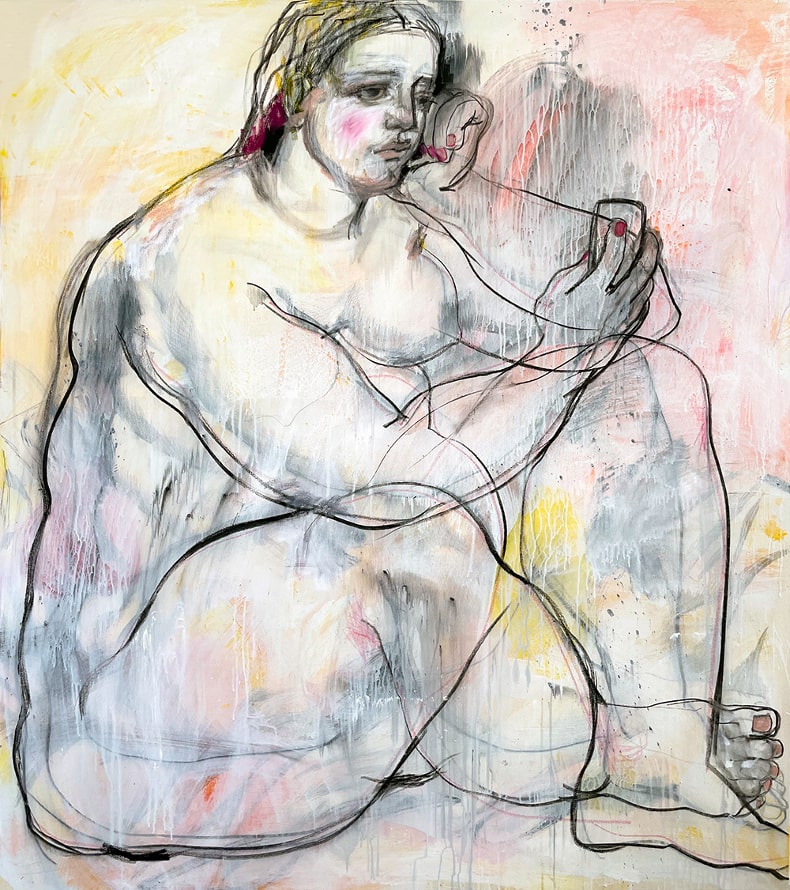 The painting „Doomscrolling“, which gives the exhibition its title, shows a voluminous seated female nude on a format of 180 by 160 centimetres, her sad pouting face propped up on one arm and reflected in the display of her mobile phone. The epitome of a contemporary Narcissa? Established in psychology and communication science, „doomscrolling“ refers to the excessive consumption of negative news via digital media. The term has become popular since the COVID pandemic and the increasing global political uncertainties since 2020 — „doom“ meaning fate, misfortune, perdition. The indiscriminate and limitless consumption of unreliable information on social networks can become an addiction and, coupled with the urge for self-affirmation, a selfreinforcing narcissistic cycle.