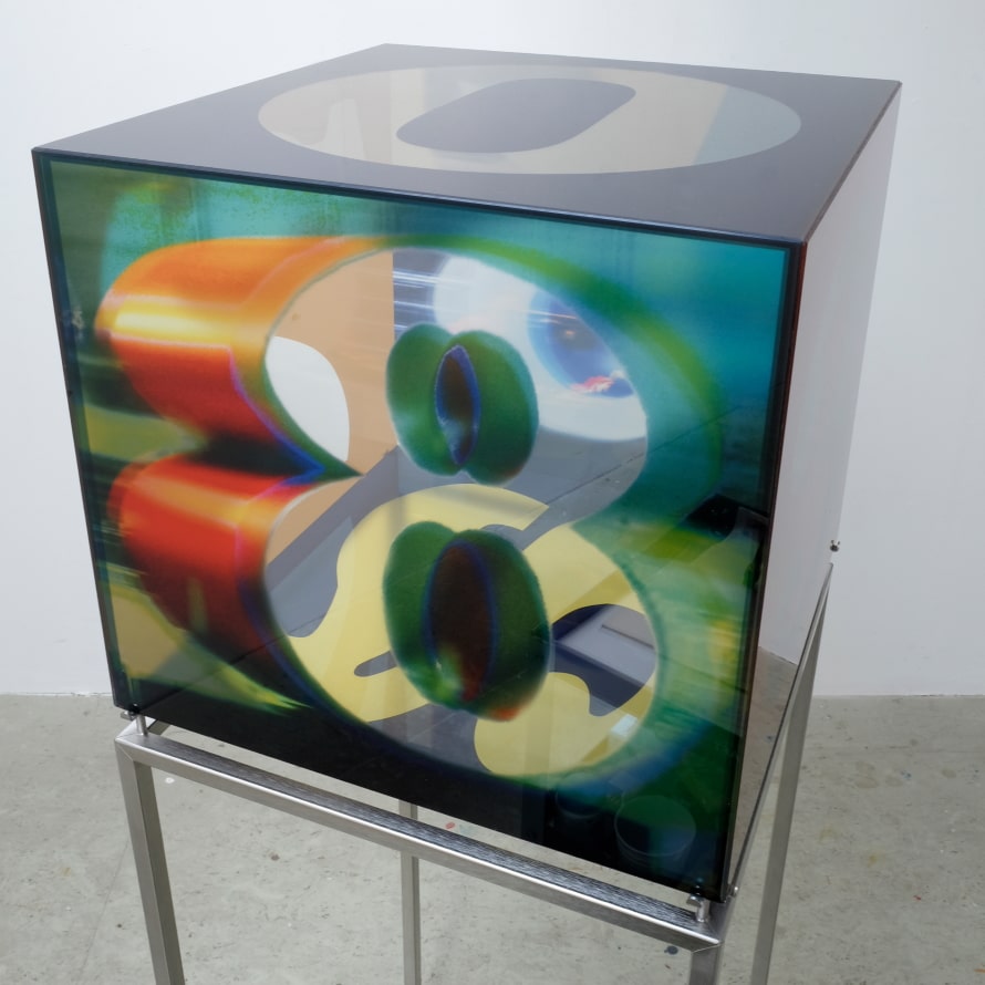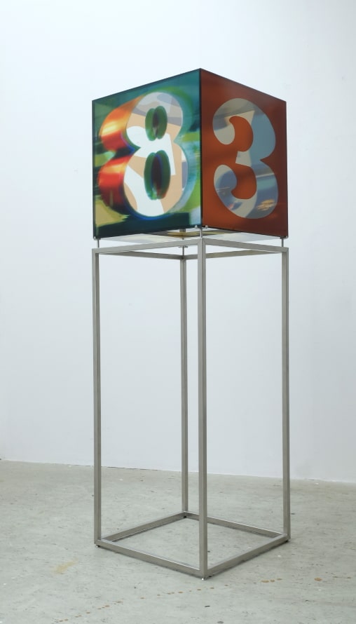 “Marina and Robert – an art liason” – the title-giving bond between Marina Herrmann and Robert Indiana becomes visible to the exhibition visitor through a transparent glass cube sculpture. With this, Marina Herrmann takes Robert Indiana’s sculptures “ONE through ZERO” to a new level. The number zero on the upward-facing side of the cube sculpture represents the continuation of Robert Indiana’s series of numbers from 1 to 9, which can be found in front of the shop windows of the banks in London’s Financial District. On closer inspection, if the viewer is not distracted by the ever more tangible and powerful numbers of the cube, photographic images of reflections in window panes present themselves. One imagines oneself standing in front of the shop windows of the banks of the Financial District of London next to Indiana’s number sculptures and looking at the reflections in the windows.