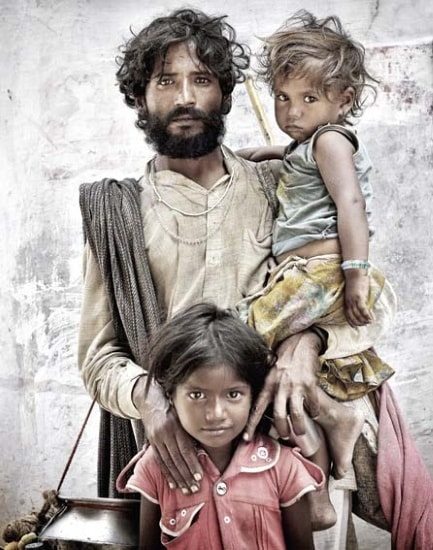 The interaction between photographic perfection and spontaneous reaction to the situation becomes especially visible in the portrait on an Indian man with his two children, which was taken in 2013. „I met this father with his two children by chance in Pushkar, Rajasthan. My driver and I had cruised the town for about seven hours and we were very tired. We were having a drink, when this beautiful man asked me for some rupees. He is a beggar. It was this incredible charisma. Immediately I began to look for a background, a wall or something similar. I asked him to stand in the shade, the sunlight from the opposite side acted as brightener. That was all. I took four to five pictures, gave him some rupees and they left.“