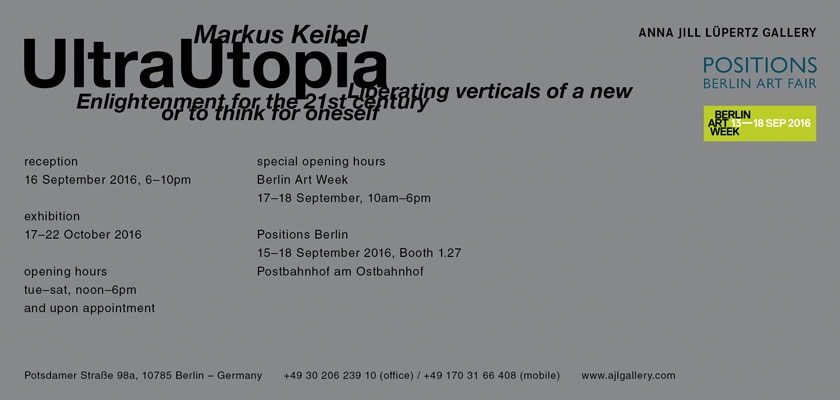 until 22.10. | #0690ARTatBerlin | Anna Jill Lüpertz Gallery presents from 17th September 2016 the exhibition UltraUtopia – Liberating Verticals of a new Enlightenment for the 21st Century or to think for Oneself – by the artist Markus Keibel.