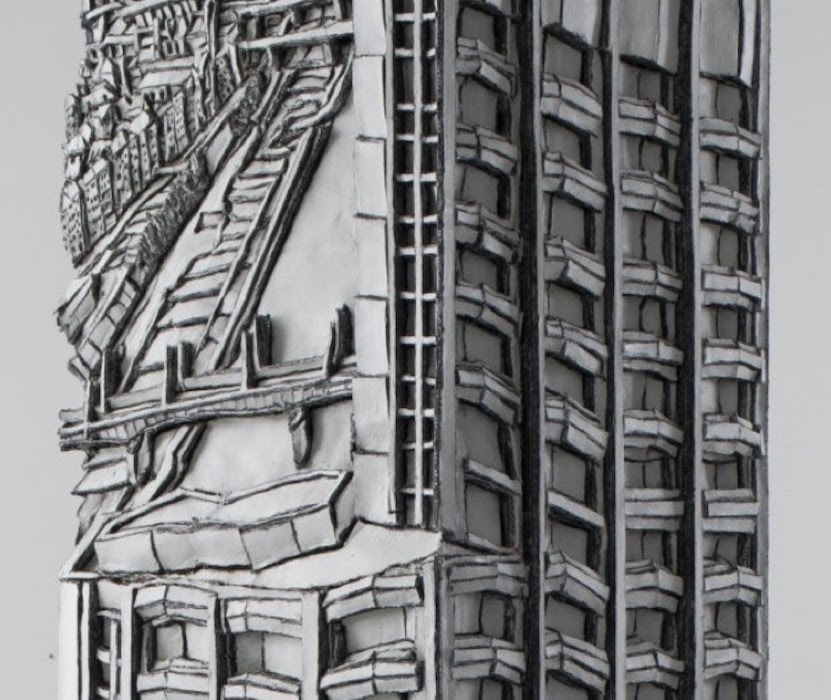The works of Martin Spengler explore the interplay between social and architectural structures, with a particular focus on the old FRG (Federal Republic of Germany), where the artist (born 1974 in Cologne) grew up and was socialized. Examples are the two reliefs of the Collini-Center in Mannheim and the sculpture of the Cologne Cathedral. Spengler was a master student of Karin Kneffel and cuts his reliefs and sculptures out of corrugated cardboard blocks, finishing the cut edges with graphite. This produces shimmering images with sharp contrasts, transforming the small-scale city views into a visual maze. The changing sunlight casts wandering shadows on the works, whose almost monochrome color communicates with the color of the room. Spengler’s mirrored images are striking and eye-catching: the Collini-Center seems to be collapsing or is located on the wrong side of the Rhine. In the case of the Cologne Cathedral, one tower comes to stand in for the entire church. The roller coaster (to mention another work in the exhibition) rides on grotesquely connected tracks. The parking garage is not fit for purpose. The Colosseum appears undistorted, as if from a postcard by Anno Dazumal. The works are such a source of visual delight that they seemingly need no further explanation. They connect to the viewers’ pictorial memory and continue to evolve alongside it, like the wave shown in the exhibition. However, there is a secondary level that links the works, via these memorized images, with cultural memory and social analysis. On the one hand, there is the motif of the Rhine, who, as Hölderlin says, “slips through Germany’s landscapes/ In silent delight, stilling his longing /With useful labour working the land / As Father Rhine, and nourishing children /In towns that he has founded.” The motif of the quintessential German river dominates a whole series of images, introducing German culture, history, as well as its romanticized interpretation. Spengler’s depiction of a high-rise building next to the Rhine (sometimes on the left, sometimes on the right) is just one of several similar images. A whole series of Rhine pictures features high-rise buildings; in addition to the Collini-Center, there are the Colonia (today: Axa) and the Ringturm in Cologne. They focus not only on the German era during which Spengler came of age but also on the social issues connected to it – especially since the high-rises chosen by Spengler were designed as miniature societies, utopian living machines uniting apartments and offices, cultural centers, and swimming pools, supermarkets and restaurants under one roof. During its existence, the West German Republic was often ridiculed by Helmut Kohl and the civil servant heirs of 1968 as a state with a shopkeeper’s mentality and as a collection of “fat provinces caught between carnivals and grape harvests, decked out with butcher shops and boutiques, as oversaturated as it is frightened.” Forty years later, in the light of Hartz IV and a never-ending wave of smaller and larger crises, the picture is changing: much of what was sneered at back then is now regarded as a much-missed civilizational achievement. Spengler’s works allude to this new FRG romanticism without falling prey to it. Their confusing labyrinths, collapsing new buildings, and striking aspects also recall the bizarre and grotesque elements that characterized the FRG: the roadblocks and socialist laws, the open chauvinism, and the plump self-satisfaction. A black romanticism of the West German Republic: FRG Noir. Spengler encourages us to look back into history and from there to the present to ask how we want to live today.“