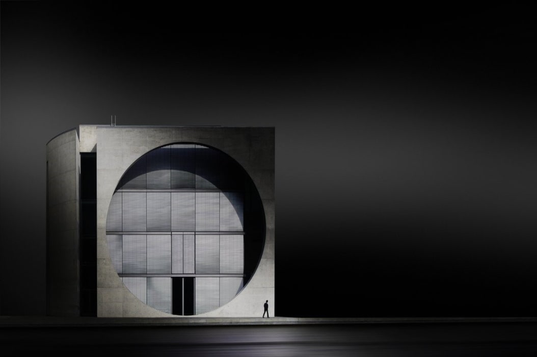 In addition, certain aspects that characterize the life of a metropolis like Berlin – such as the pulsating hustle and bustle of the squares and streets – are often omitted. One looks in vain for the omnipresent crowds and the turbulent traffic in the artist’s pictures. This non-presence of the social and societal life of the big city is probably the most striking feature of the photographs. Rarely is a person to be seen in the artist’s works. When Köster does “launch” him in his pictures, the human being appears shadowy, anonymous, and meaningless in comparison to the powerful architecture that dominates the composition of the picture. Moreover, man seems to have no sense of his surroundings. He hurries, introverted or with his eyes fixed on his cell phone, towards an unknown destination.